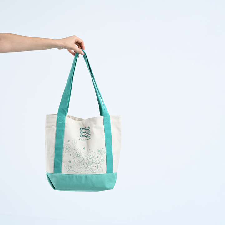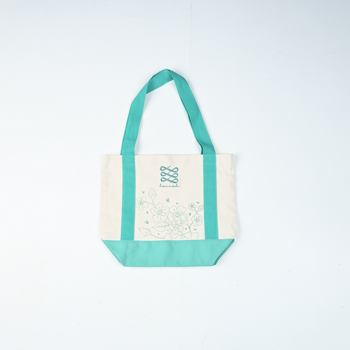 حقيبة قماش مصنوعة من خامة كانفاس عالية الجودة بتصميم مميز وأنيق، مناسبة وعملية، مزودة بمساحة داخلية واسعة للتخزين، تتميز بحزام كتف واسع ومريح، صديقة للبيئة، متألقة بالتطريز والطباعة الجذابة باللون الفيروزي المشرق.