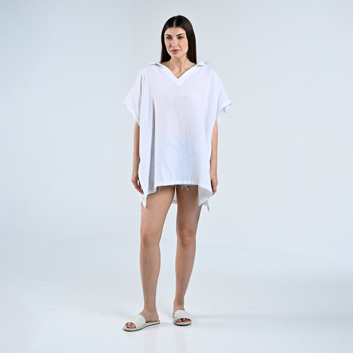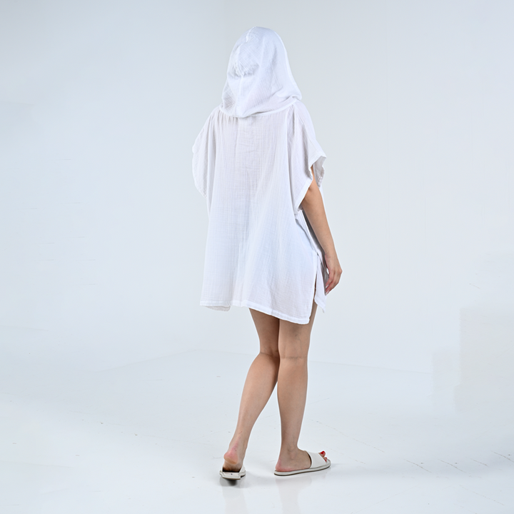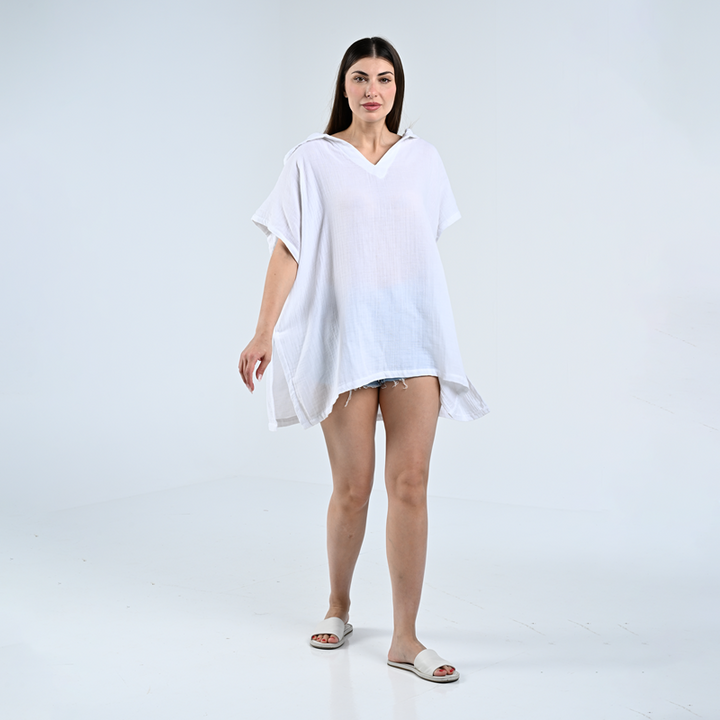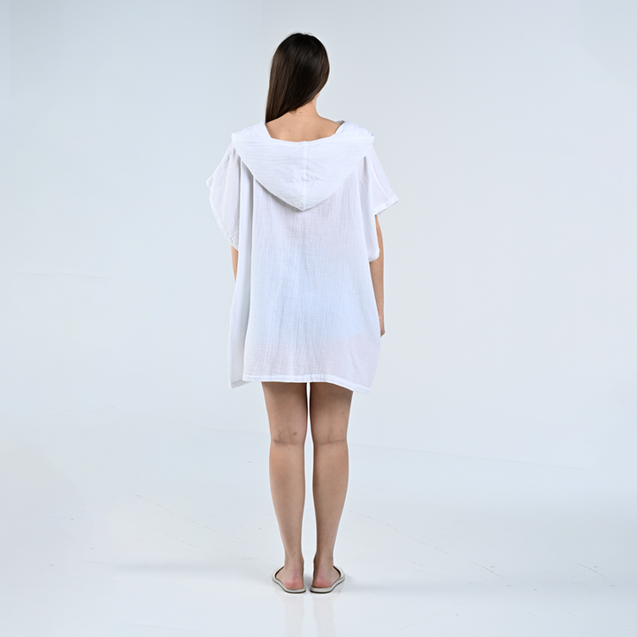 غطاء مصنوع من قطن طبيعي 100% . مثالي لتغطية ملابس السباحة أو لإضافة لمسة أنيقة لإطلالتك الصيفية. يتميز بتصميم فضفاض يسمح بمرور الهواء ، مما يجعله مريحًا ومنعشًا عند ارتدائه على الشاطئ أو حمام السباحة. يتميز بقصّة فضفاضة، وأكمام قصيرة، وغطاء رأس مدمج لحماية إضافية من الشمس، وطول يصل إلى منتصف الفخذ. صُمم بعناية ليعكس جودة الخامة وتفاصيلها، مما يجعله قطعة أساسية لإطلالتك الصيفية على.