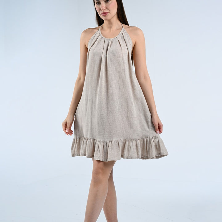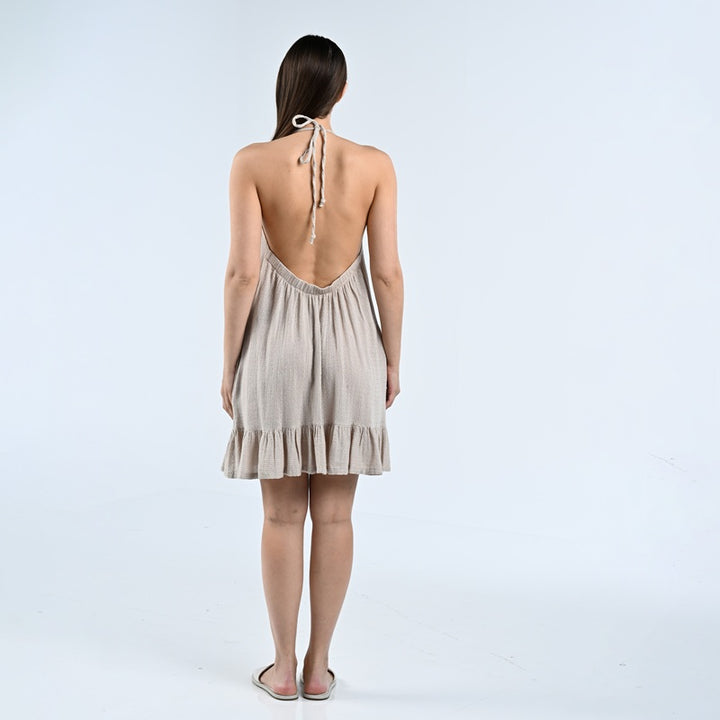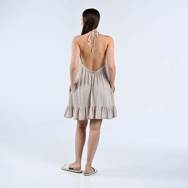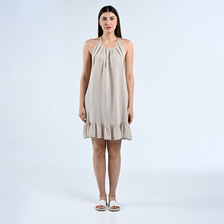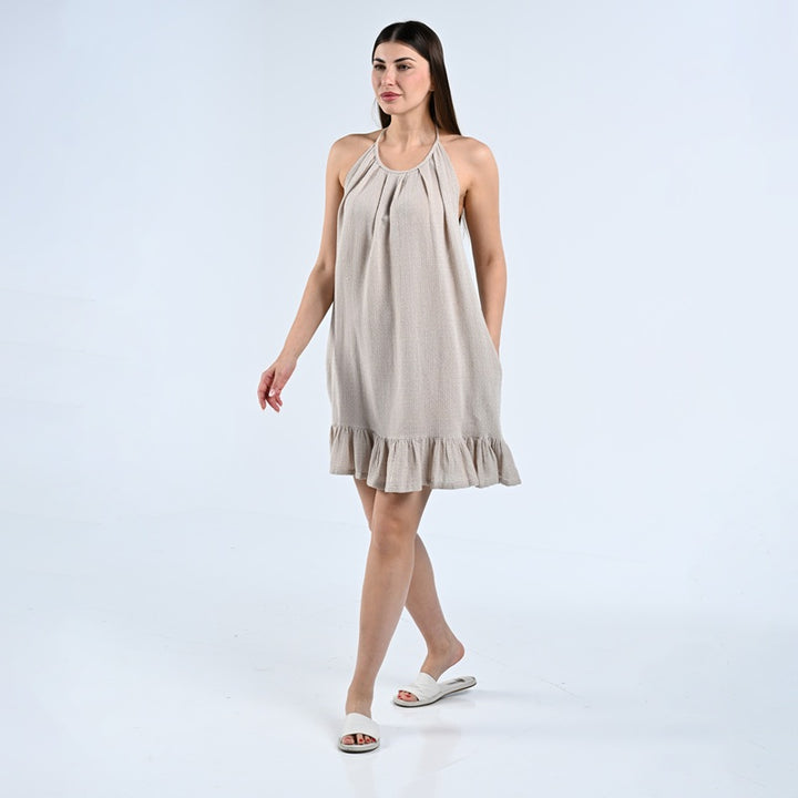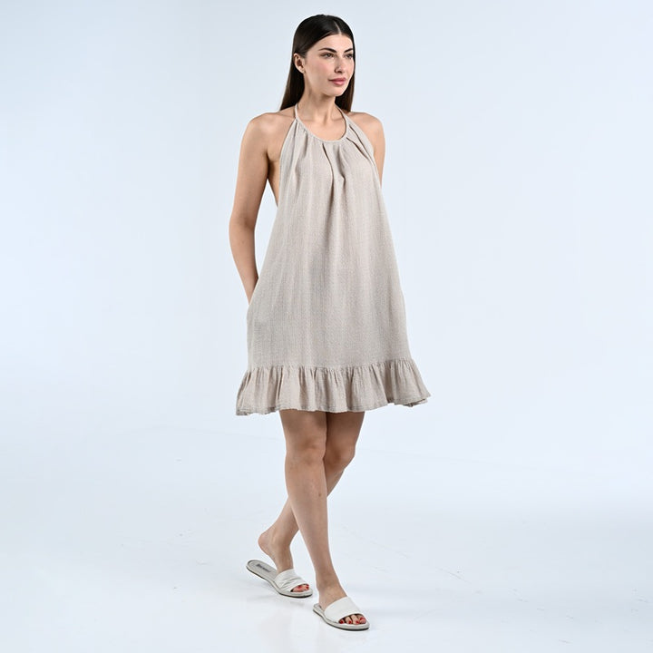 فستان قصير مصنوع من الكتان الطبيعي 100% . يتميز بقصّة قصيرة مع فتحة ظهر يُضفي لمسة أنثوية. يُمكنكِ ارتداء الفستان بمفرده لإطلالة صيفية مريحة، كما أنه خيار مثالي لإطلالات النهار أو رحلات الشاطئ.