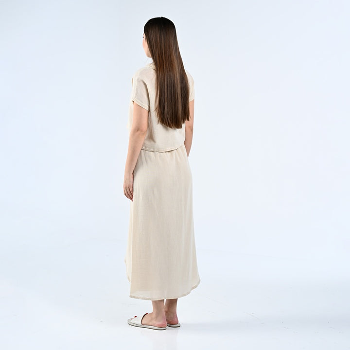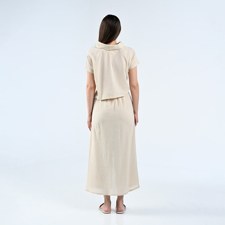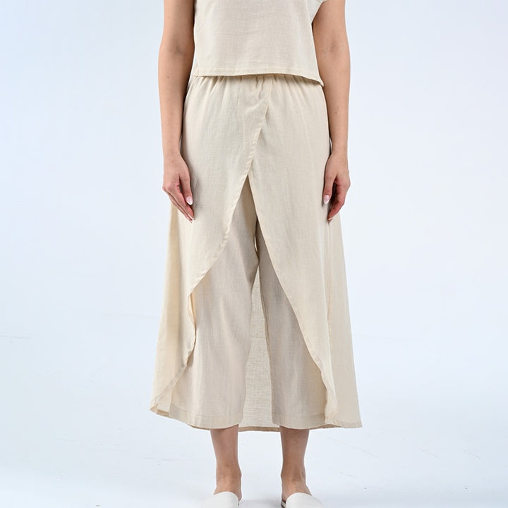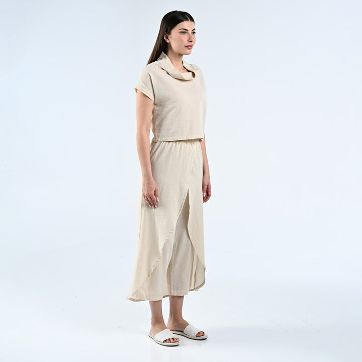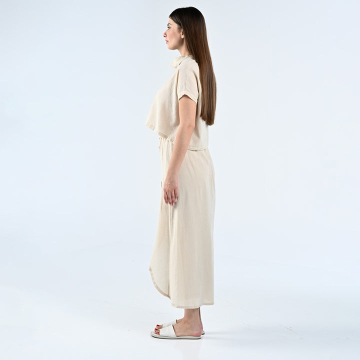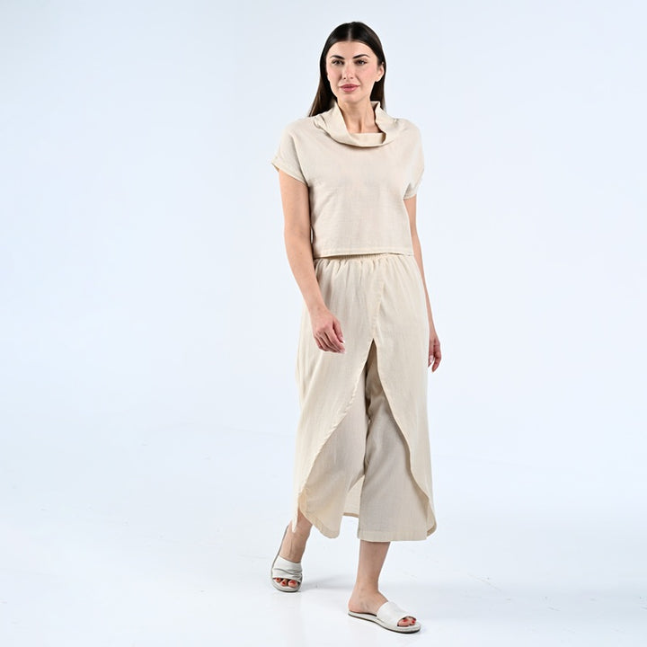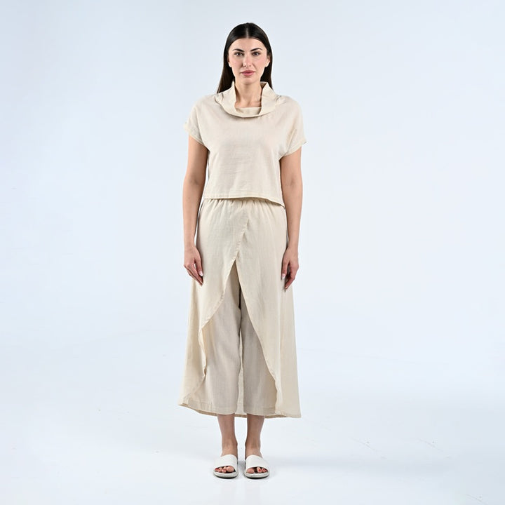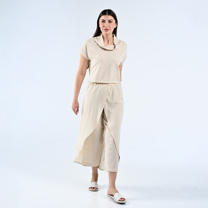 طقم من بلوزة وبنطلون مصنوعة من الكتان الطبيعي بنسبة 100%. يتميز الجزء العلوي بتصميم أنيق بياقة عالية، بينما يتميز البنطلون بقصّة فريدة ومتداخلة. مثالية للأيام الحارة والاستخدام اليومي.
