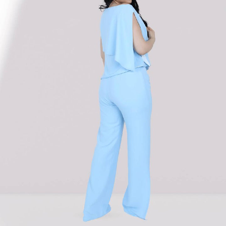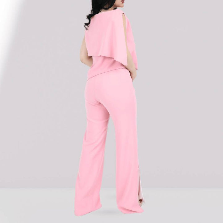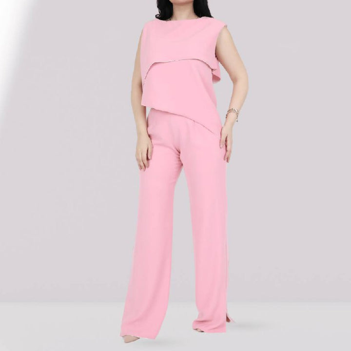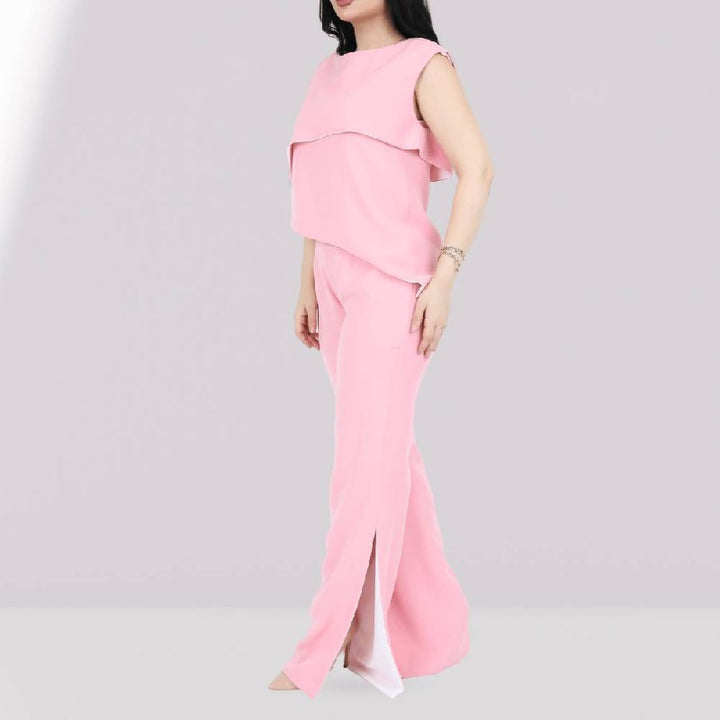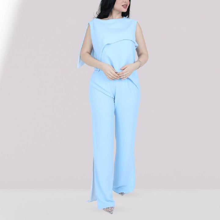 طقم بلوزة وبنطال مصنوع من الكريب عالي الجودة. يتميز القميص بتصميم أنيق متعدد الطبقات يتناسق مع الجسم تمامًا، مع كمّ بفتحة انسيابية ، وبنطلون رسمي أنيق بفتحة جانبية.