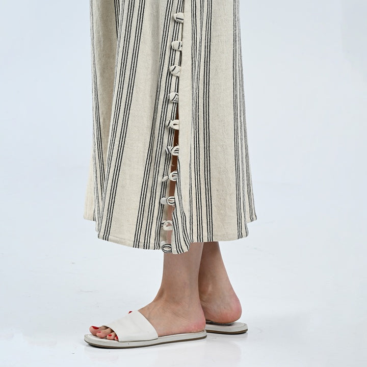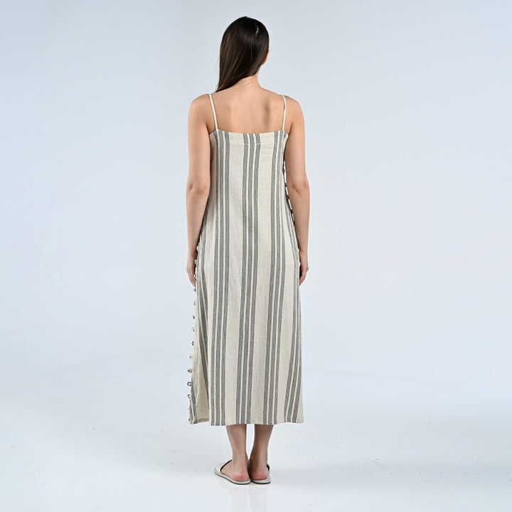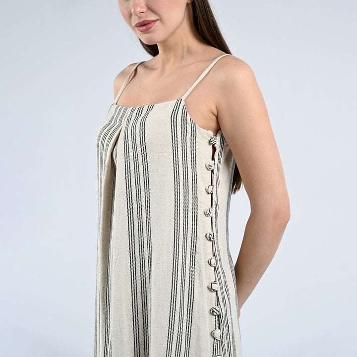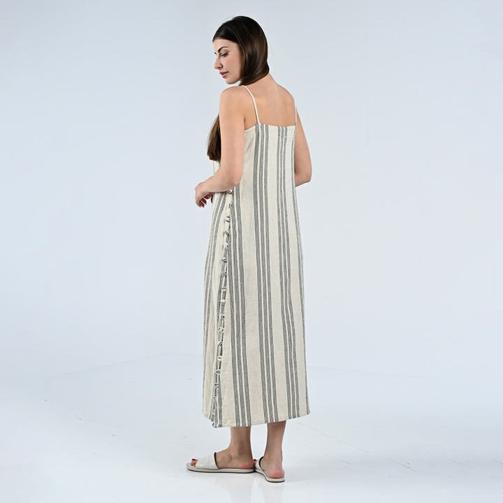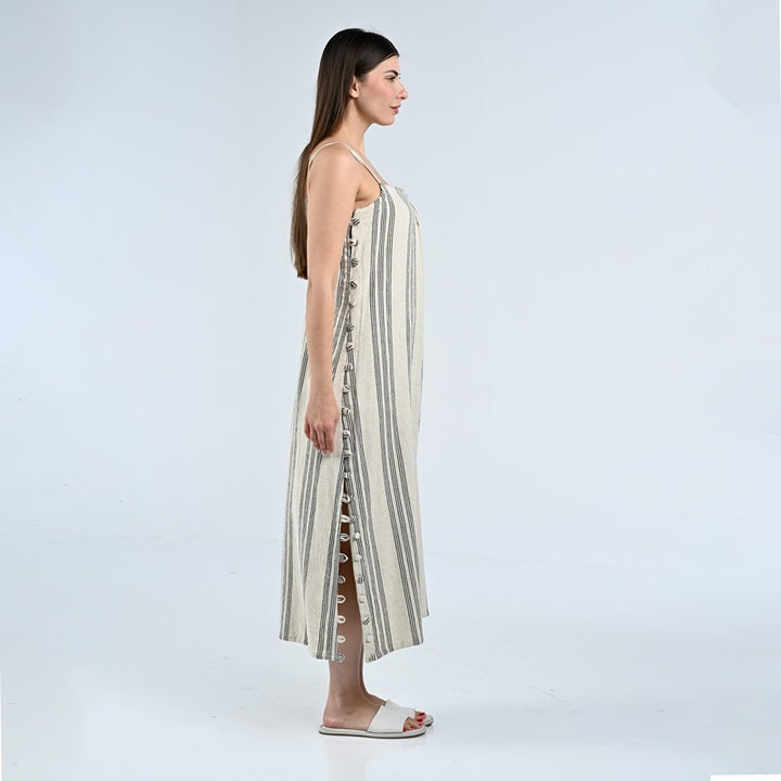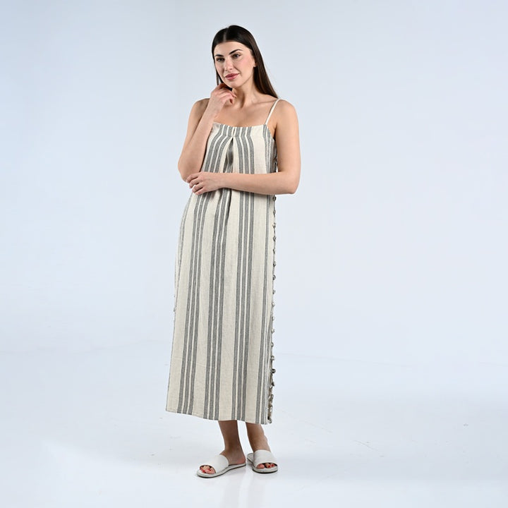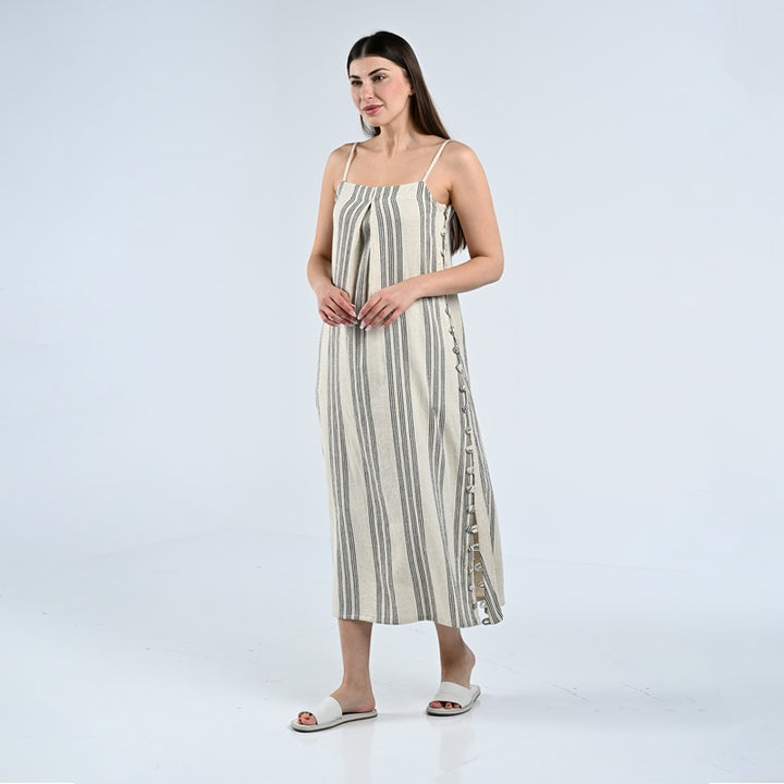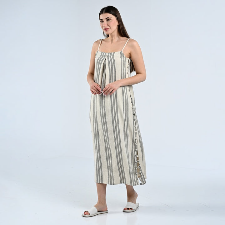 فستان ناعم وطويل، مصنوع من الكتان الطبيعي 100%. يتميز بتصميمه البسيط وحزامه الرفيع الذي يضفي لمسة أنثوية ناعمة، يمكنكِ ارتداء الفستان بمفرده لإطلالة صيفية كاجوال، كما أنه خيار مثالي لإطلالات النهار أو رحلات الشاطئ.