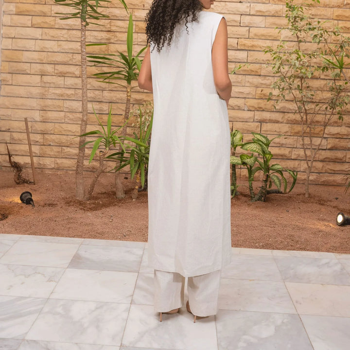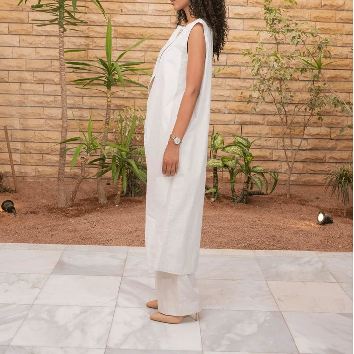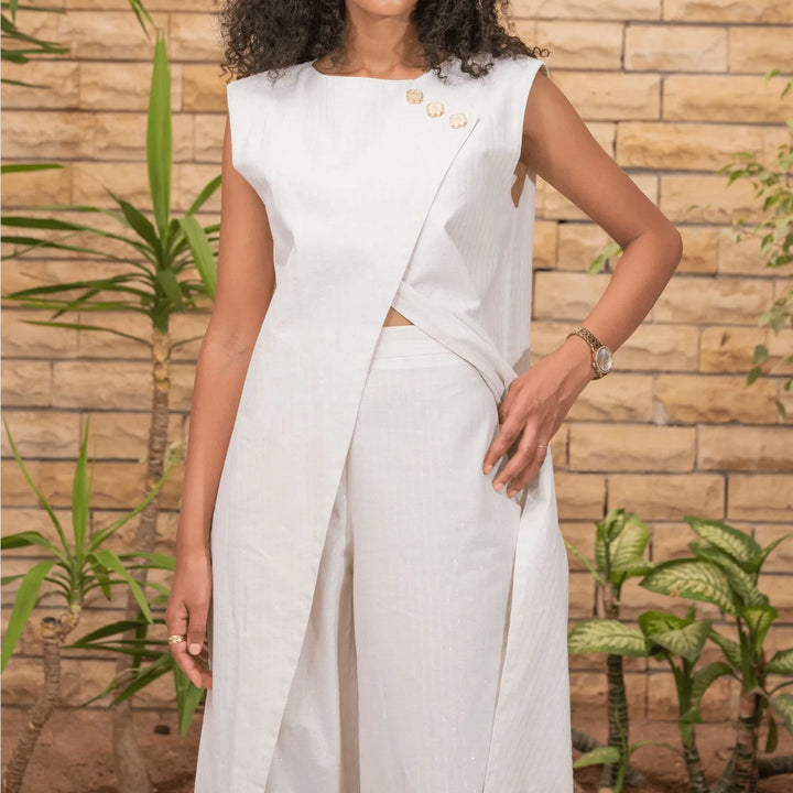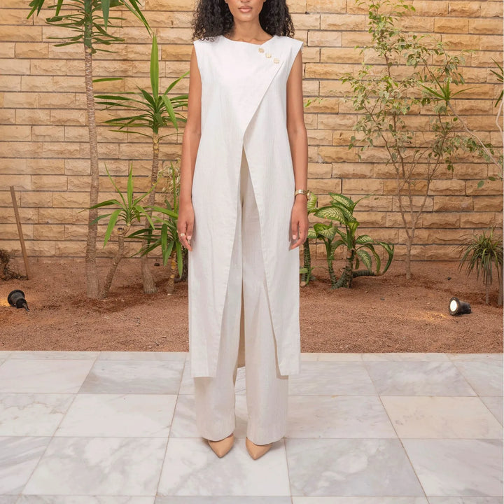 طقم أنيق مكون من بلوزة طويلة بقصة متقاطعة وبنطلون. مصنوع من قماش النن الطبيعي 100%.