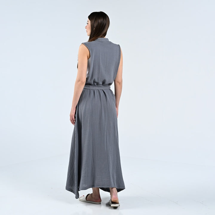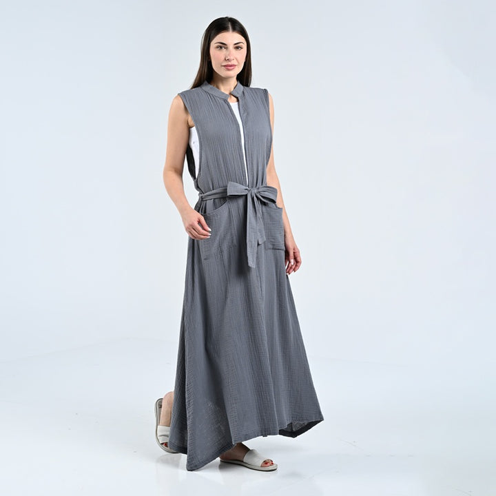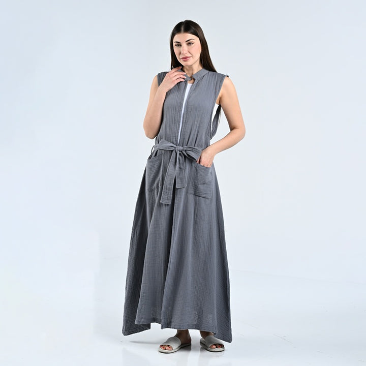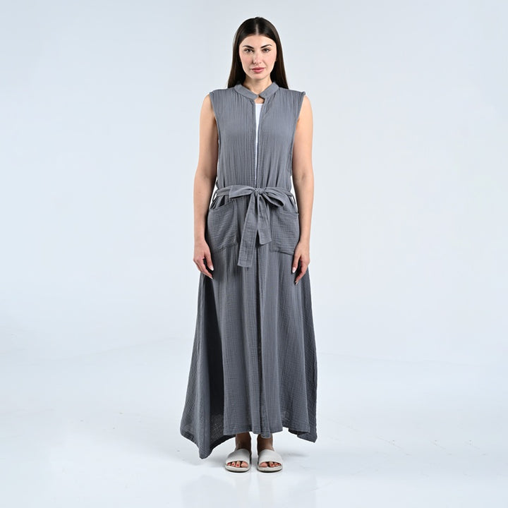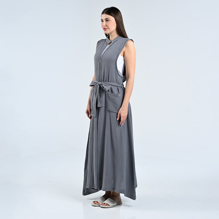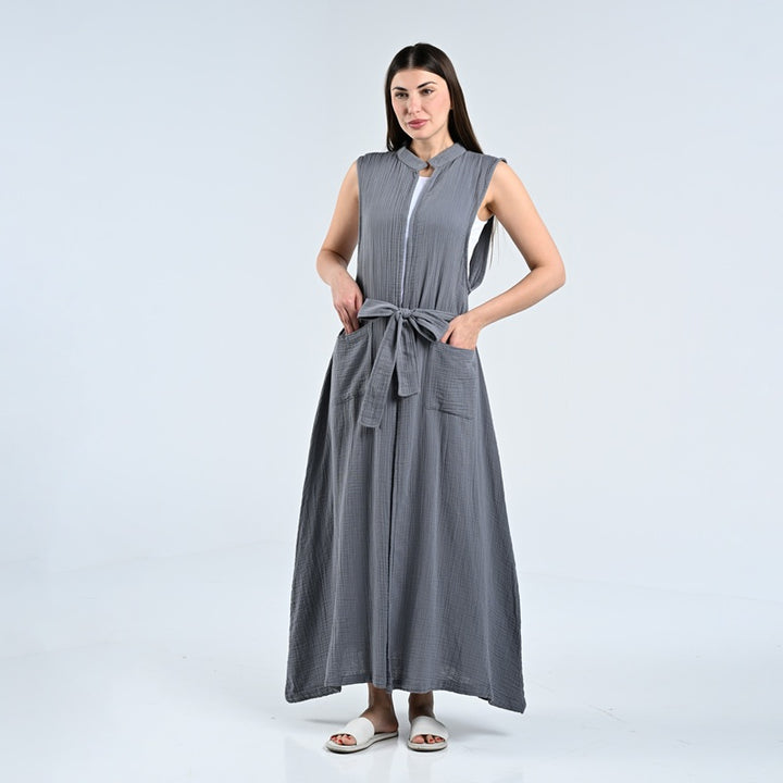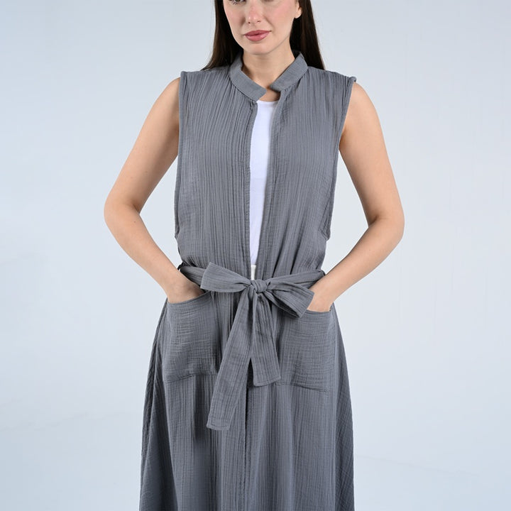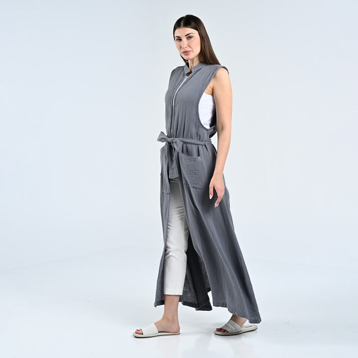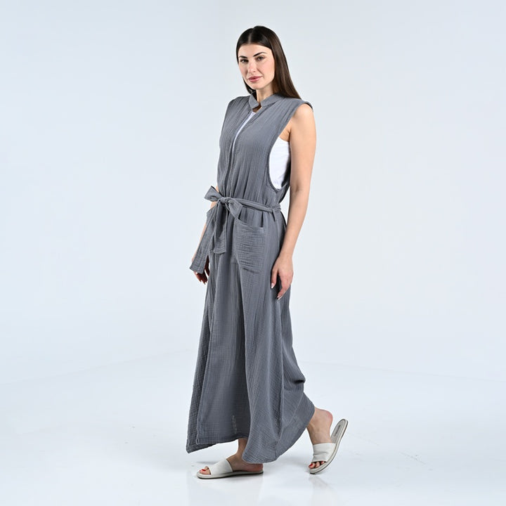 sleeveless kimono, 100% natural cotton. with a built-in belt and side pockets. ideal for wearing with other pieces for a chic and comfortable daytime look.