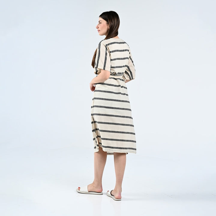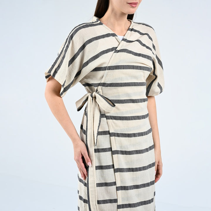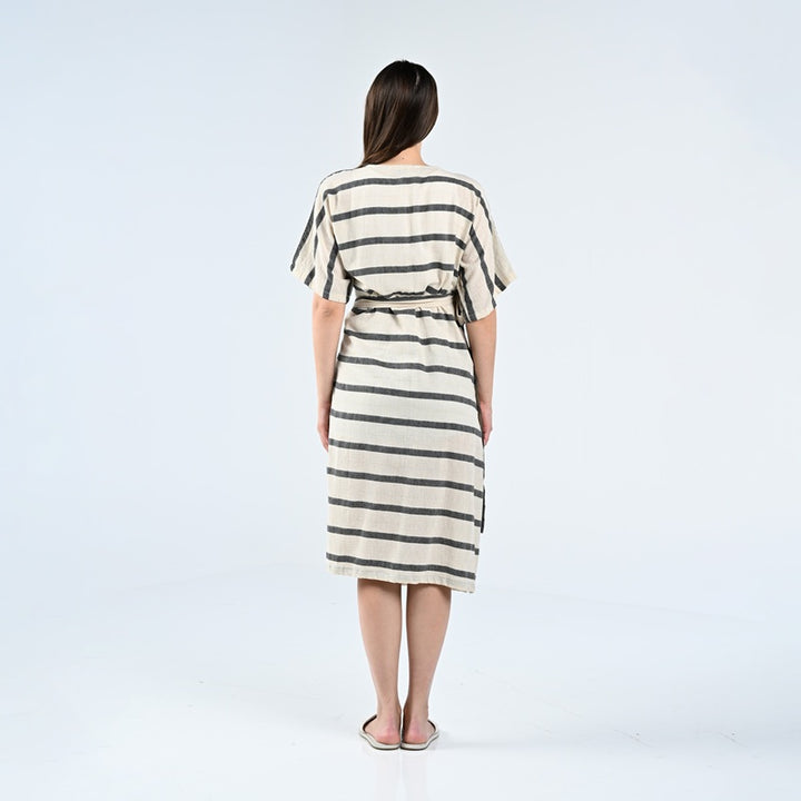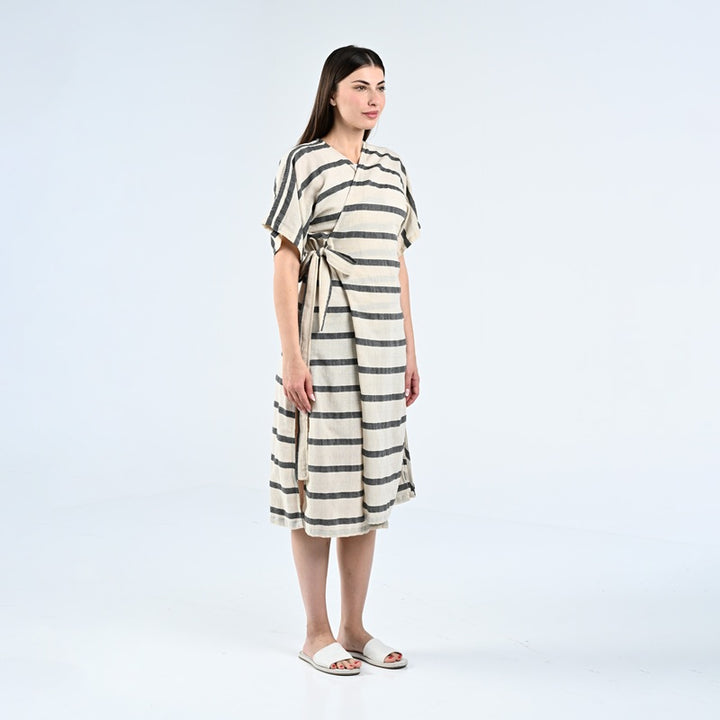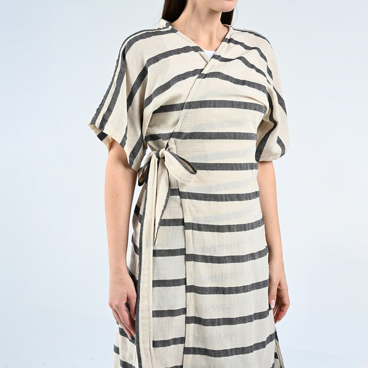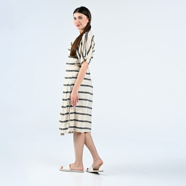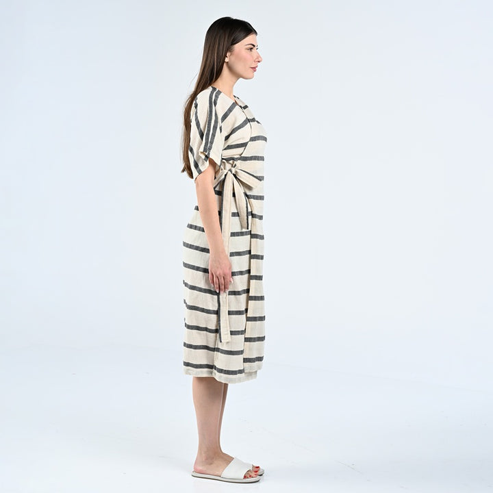 A wrap dress made of 100% natural linen. loose fit with a belt that can be tied at the waist, allowing you to define your size. It's a comfortable everyday piece around the house, or style it with other outfits for a stylish and versatile daytime look.