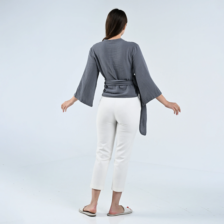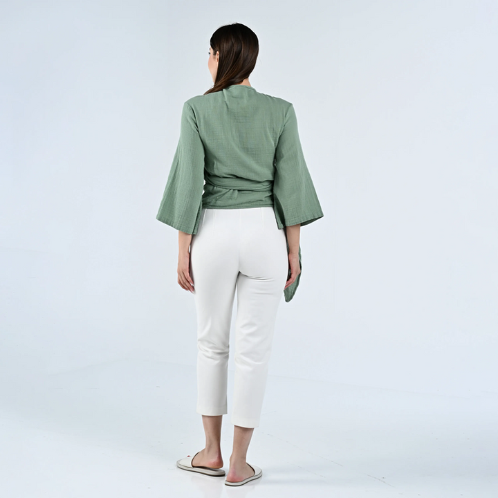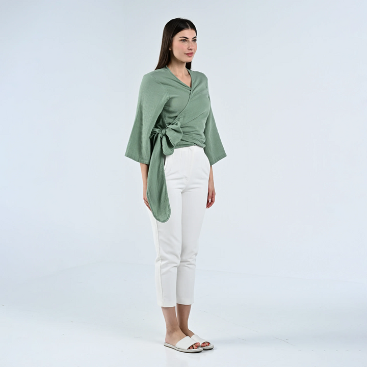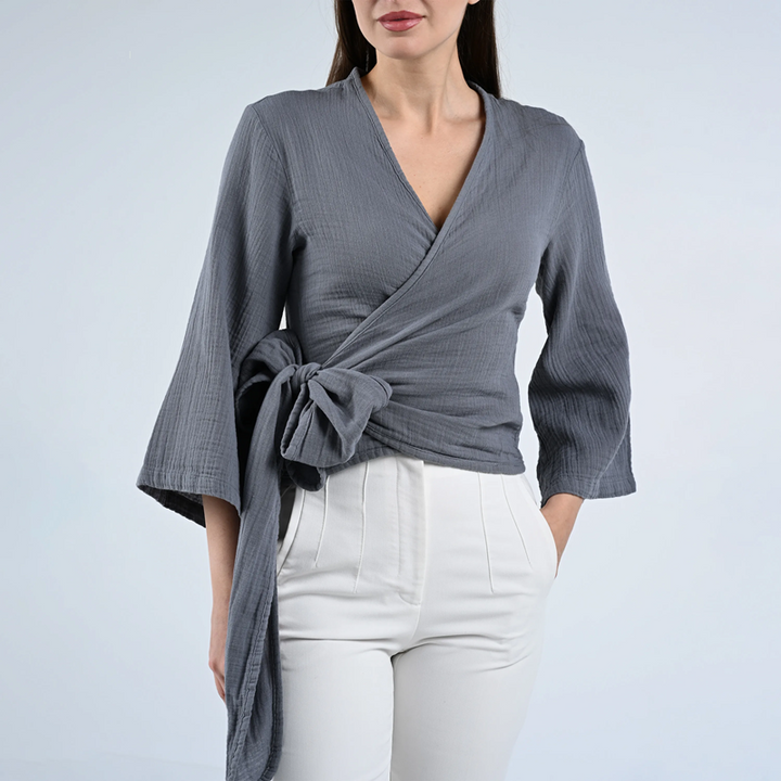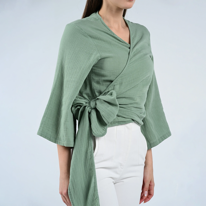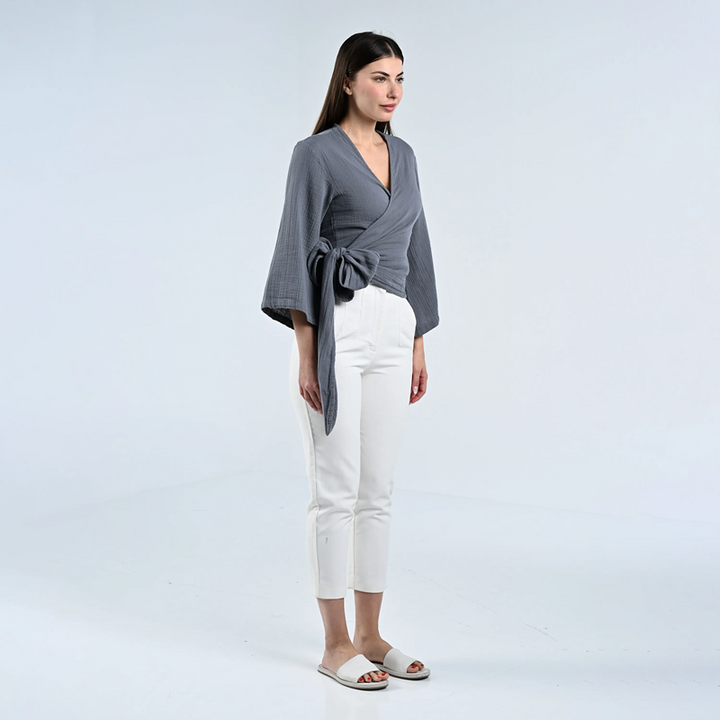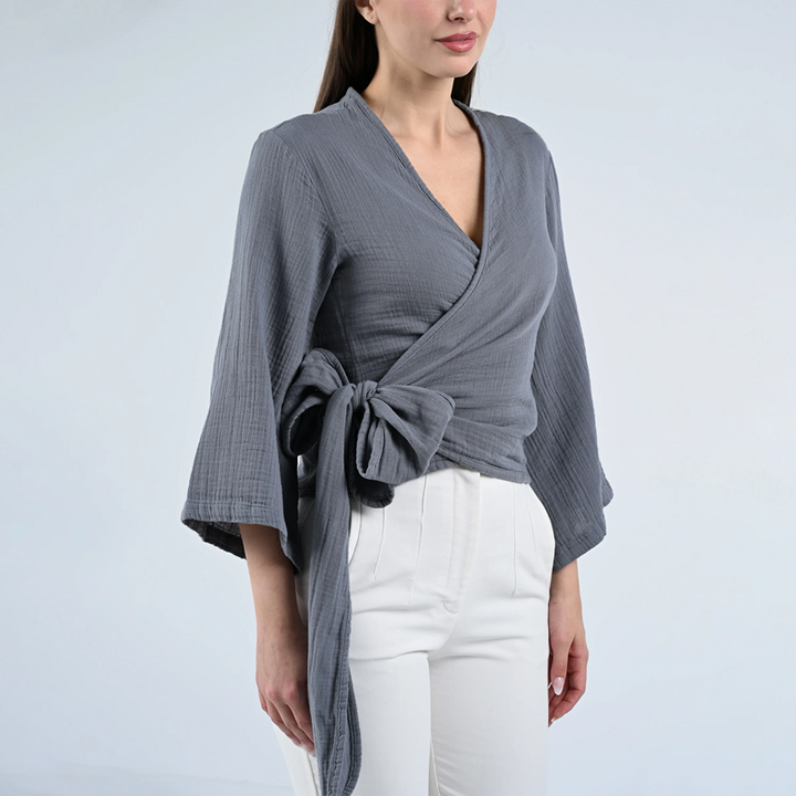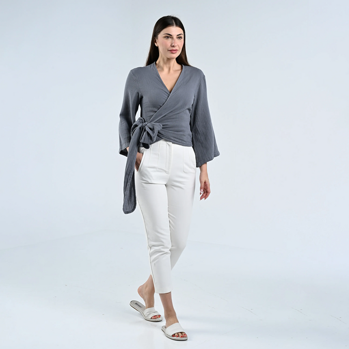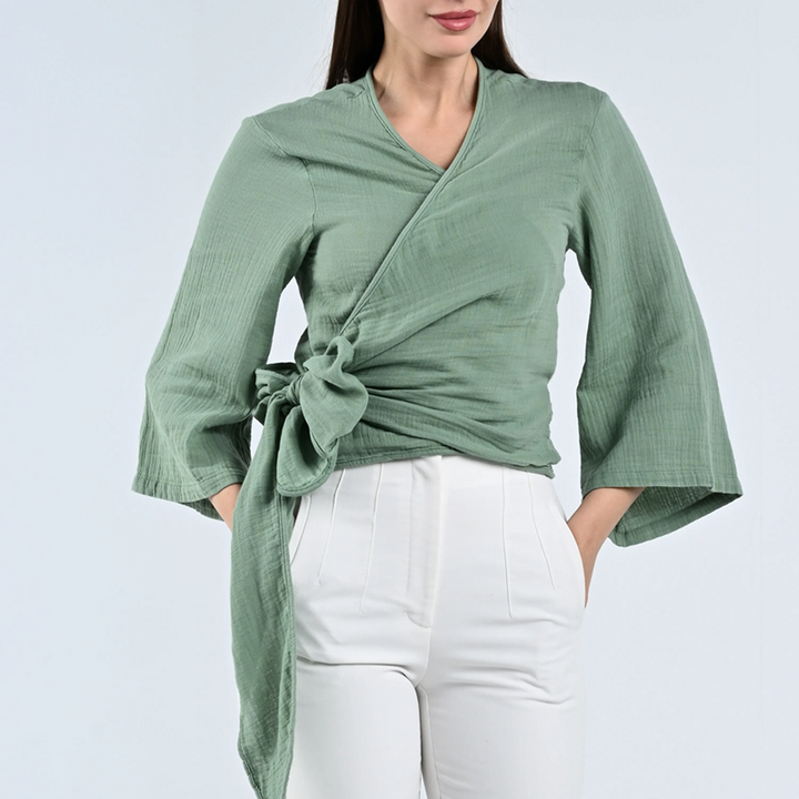 A wrap top with a built-in belt is made from 100% natural cotton. The top features a wrap design that wraps around the body and is tied with a built-in belt of the same material, allowing you to elegantly define your waist. It is ideal for warmer weather. This top can be worn casually with jeans or a skirt, or styled for a more formal look.
